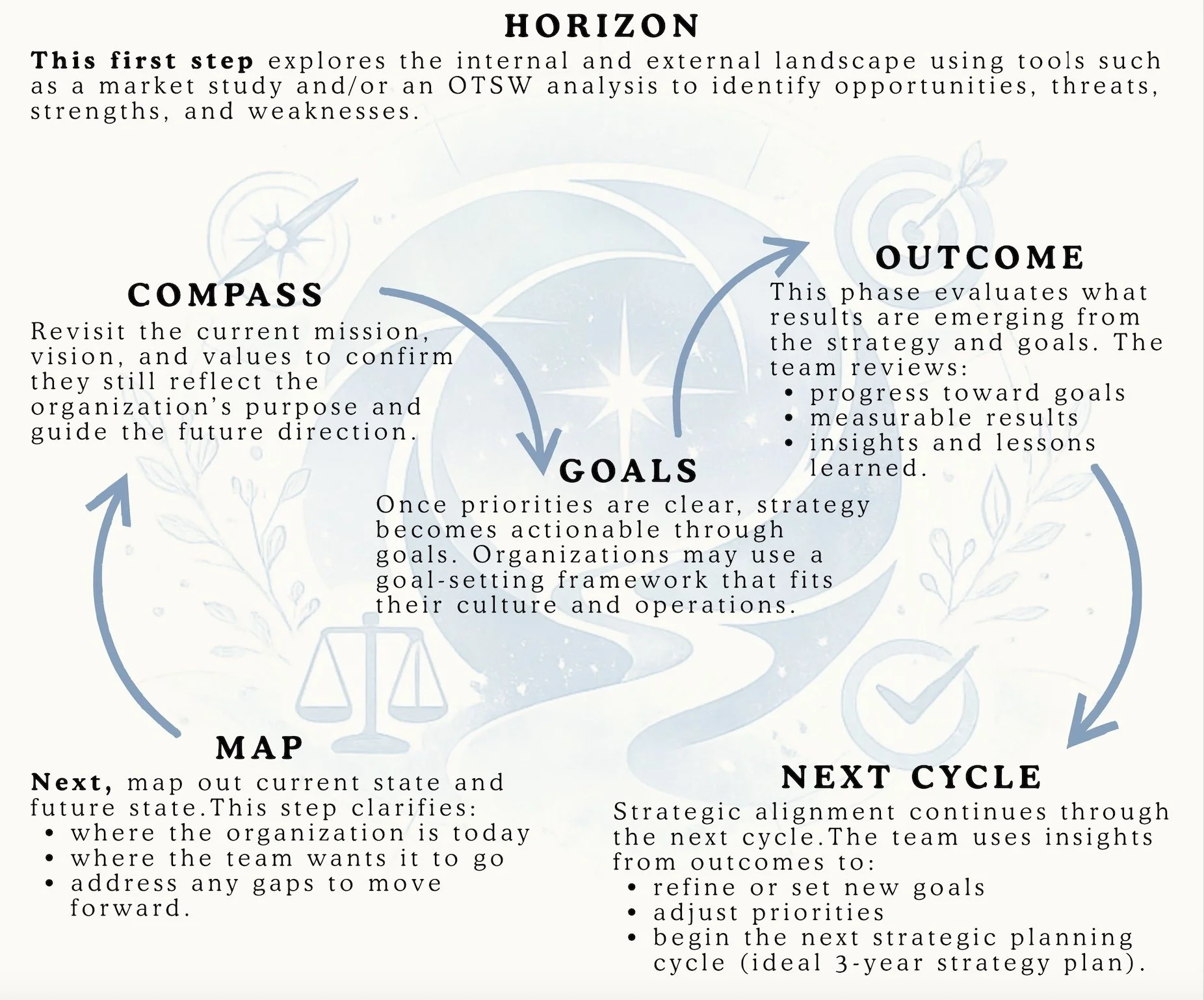 The journey begins with a critical question: What is on the horizon? From there, teams move through a clear, structured process, reconnecting to the mission, vision, and values, mapping the path forward, and building each phase, translating strategy into actionable goals.